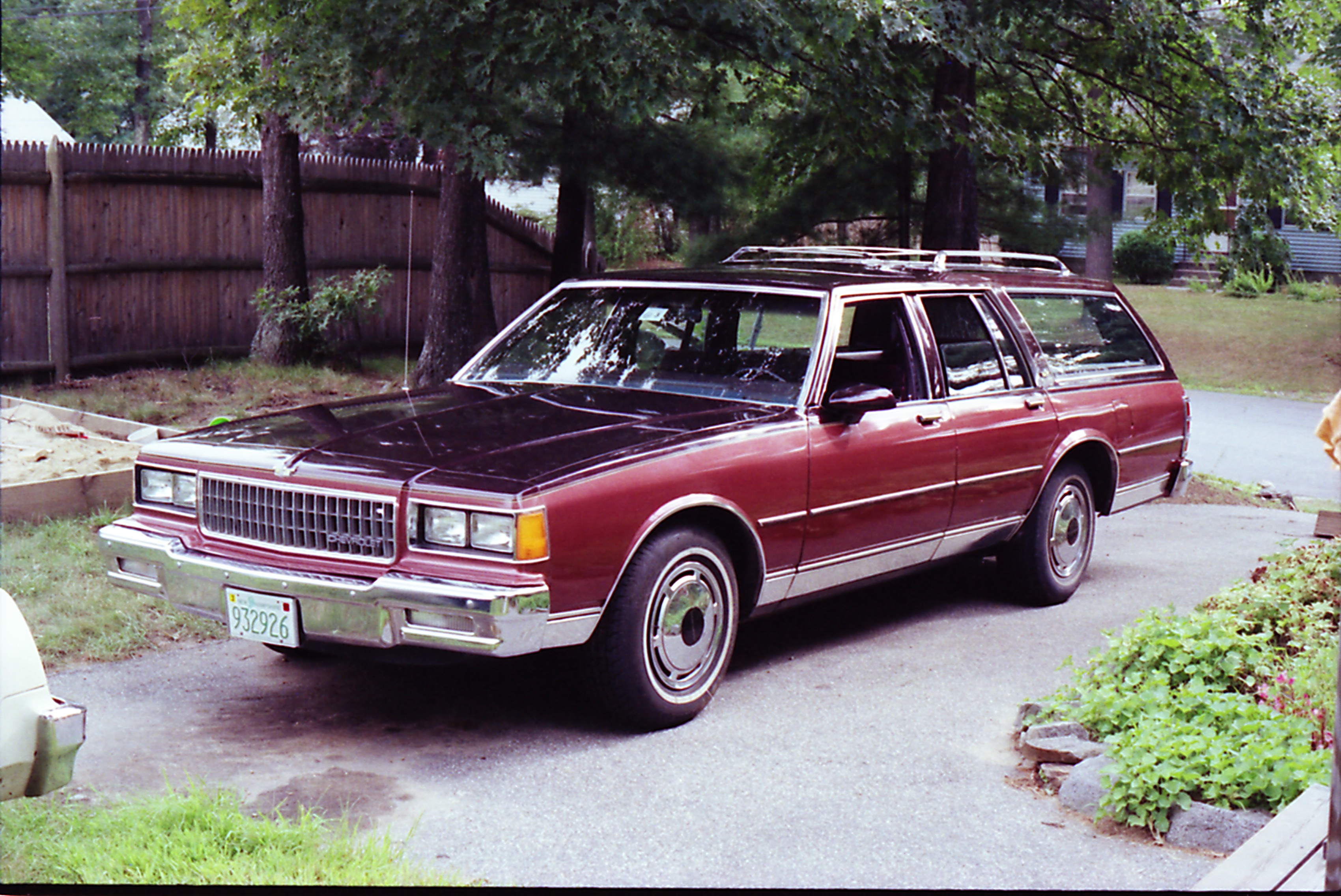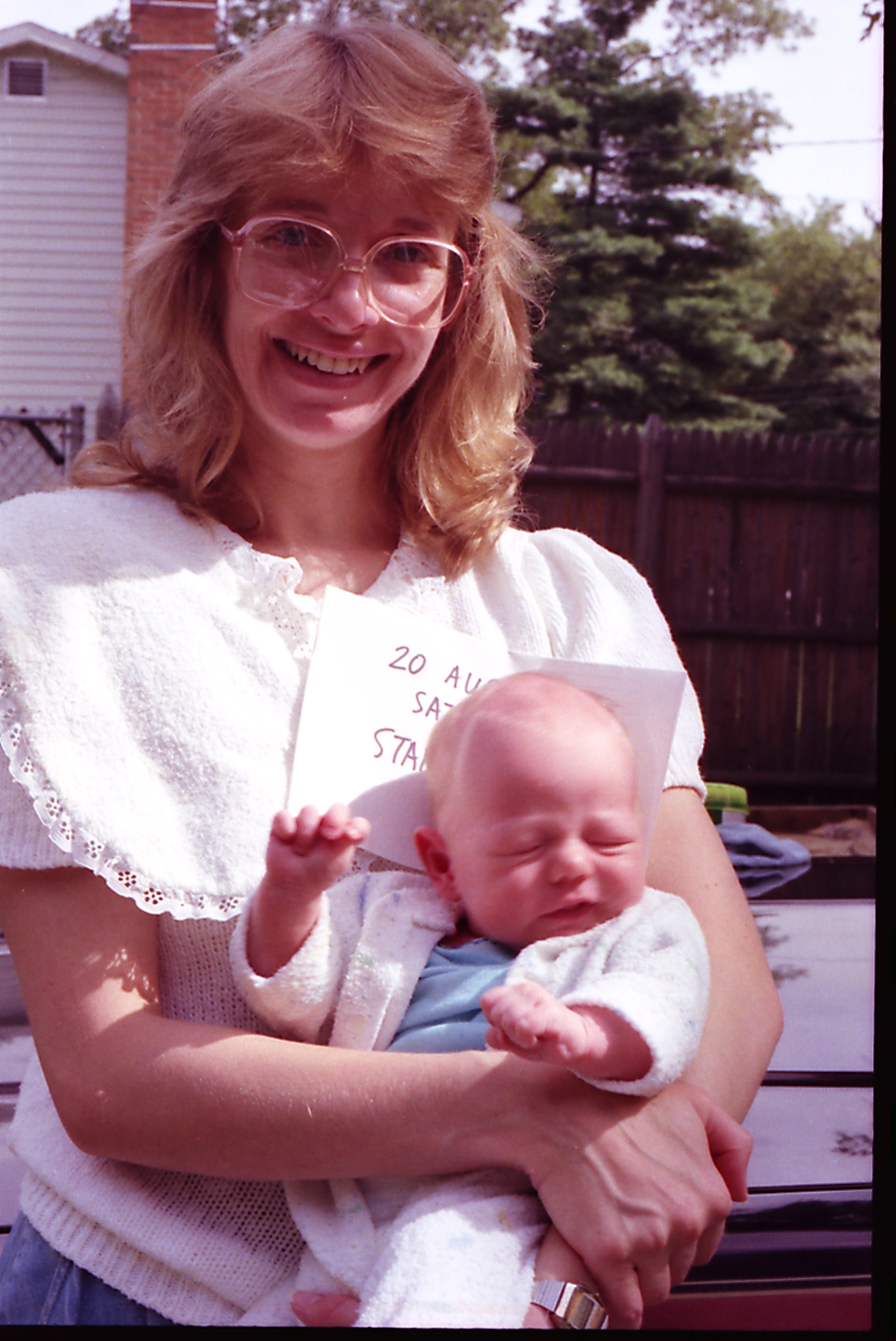 • Joyce holding 2 week old Stanford next to our newly purchased 1986 Caprice Classic station wagon. (01-03)